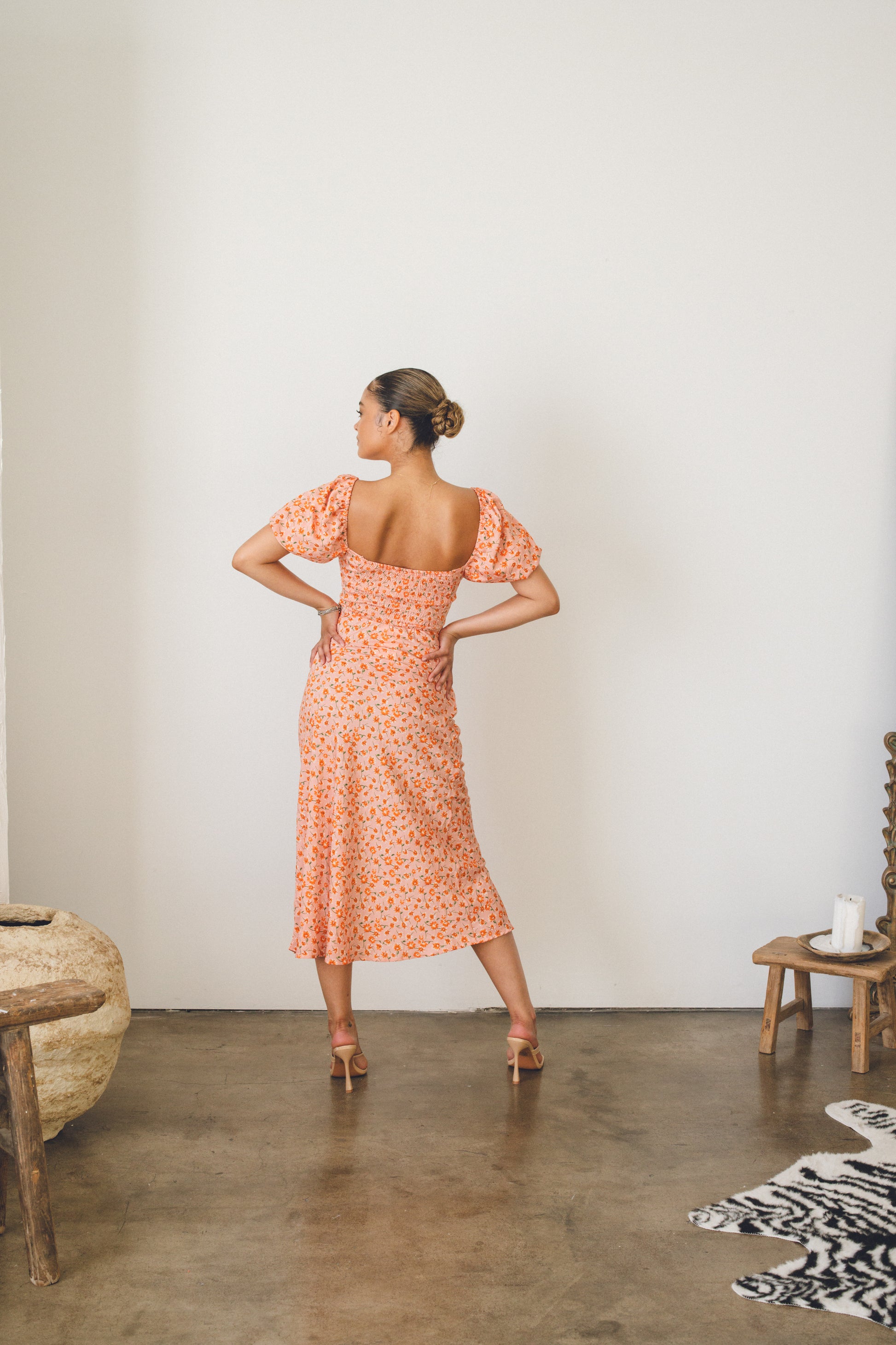 Our romance midi dress with a fem hue and floral design is a summer vibe! The flirty design features a front cut-out detail with a mid section tie that can be adjusted. Wear this to brunch, on a date but no matter what, be ready for the compliments that this dress will bring- PERIOD! Pair it with dainty gold hoops, a mini purse and a simple necklace!