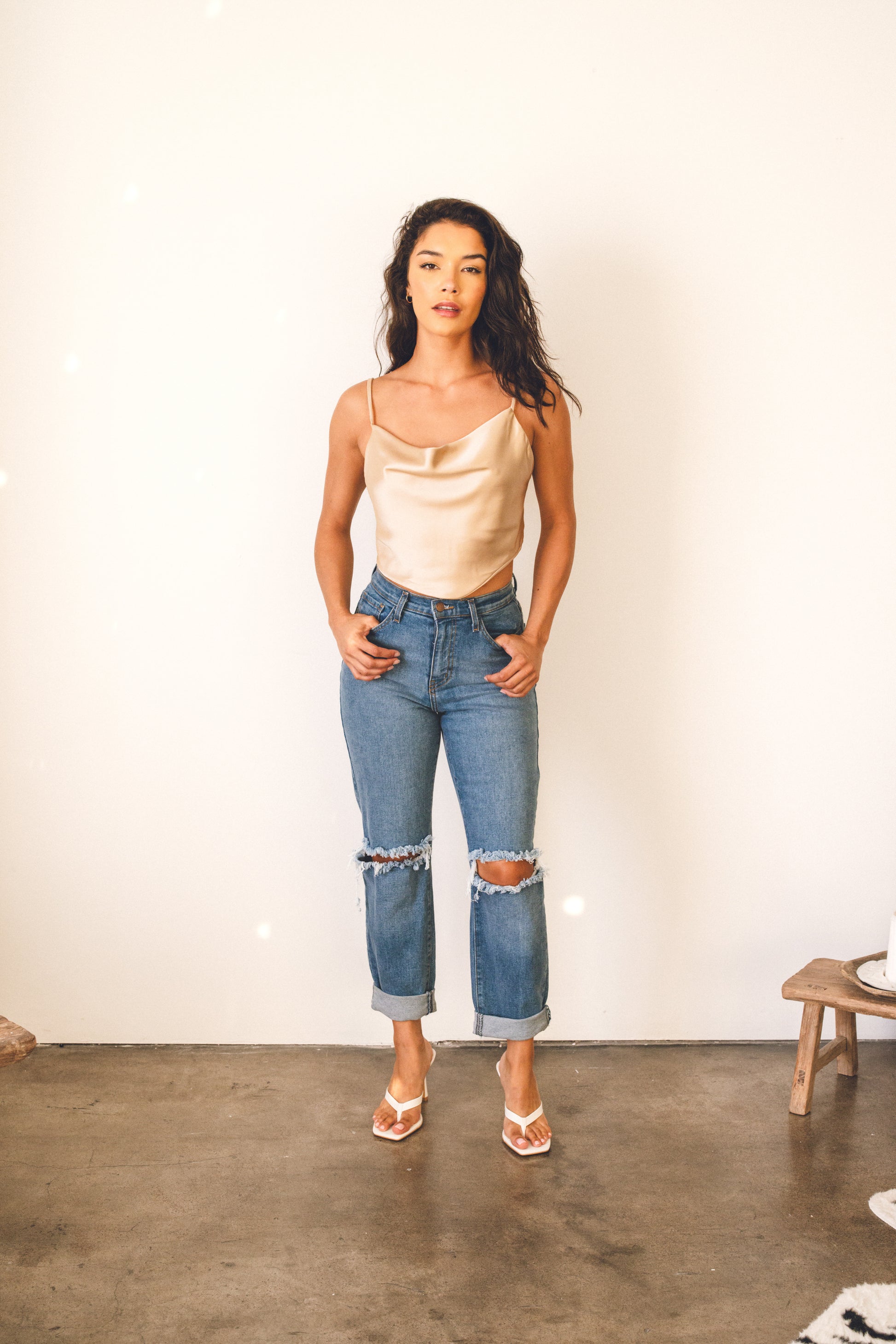 Sleek Indy Style Satin top adds a touch of sexy to a simple outfit. The design features a draped neckline, a sleeveless bandana hem bodice, and a lovely tie-back. Complete with no stretch, stays in place. Perfect top to wear casually or dress it up with trousers or a skirt for a night out!