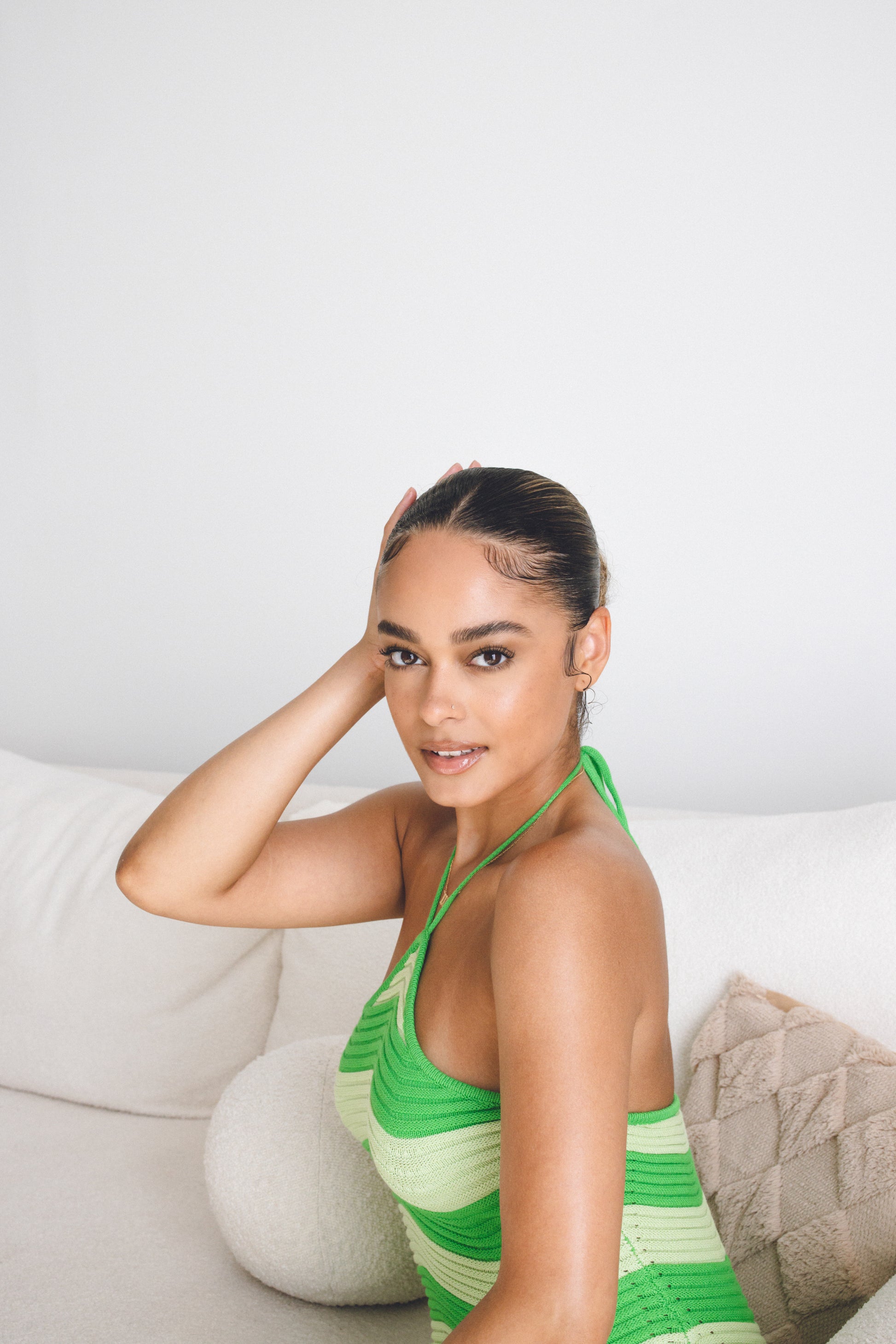 This halter crochet mini dress is QUALITY HONEYY! The fabrication on this dress is impressive! This dress has a color block two- tone green chevron stripe pattern. Perfect for summer!