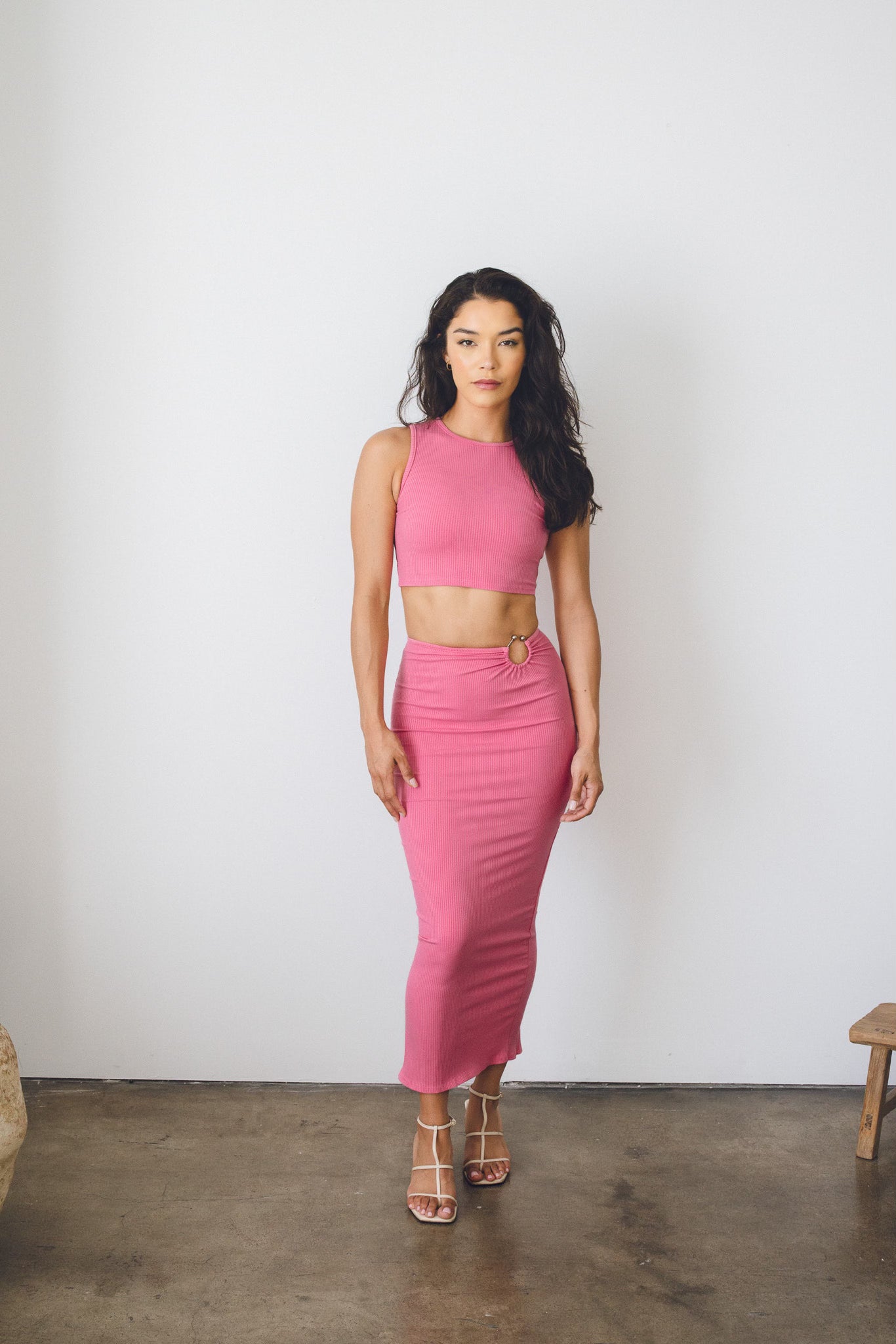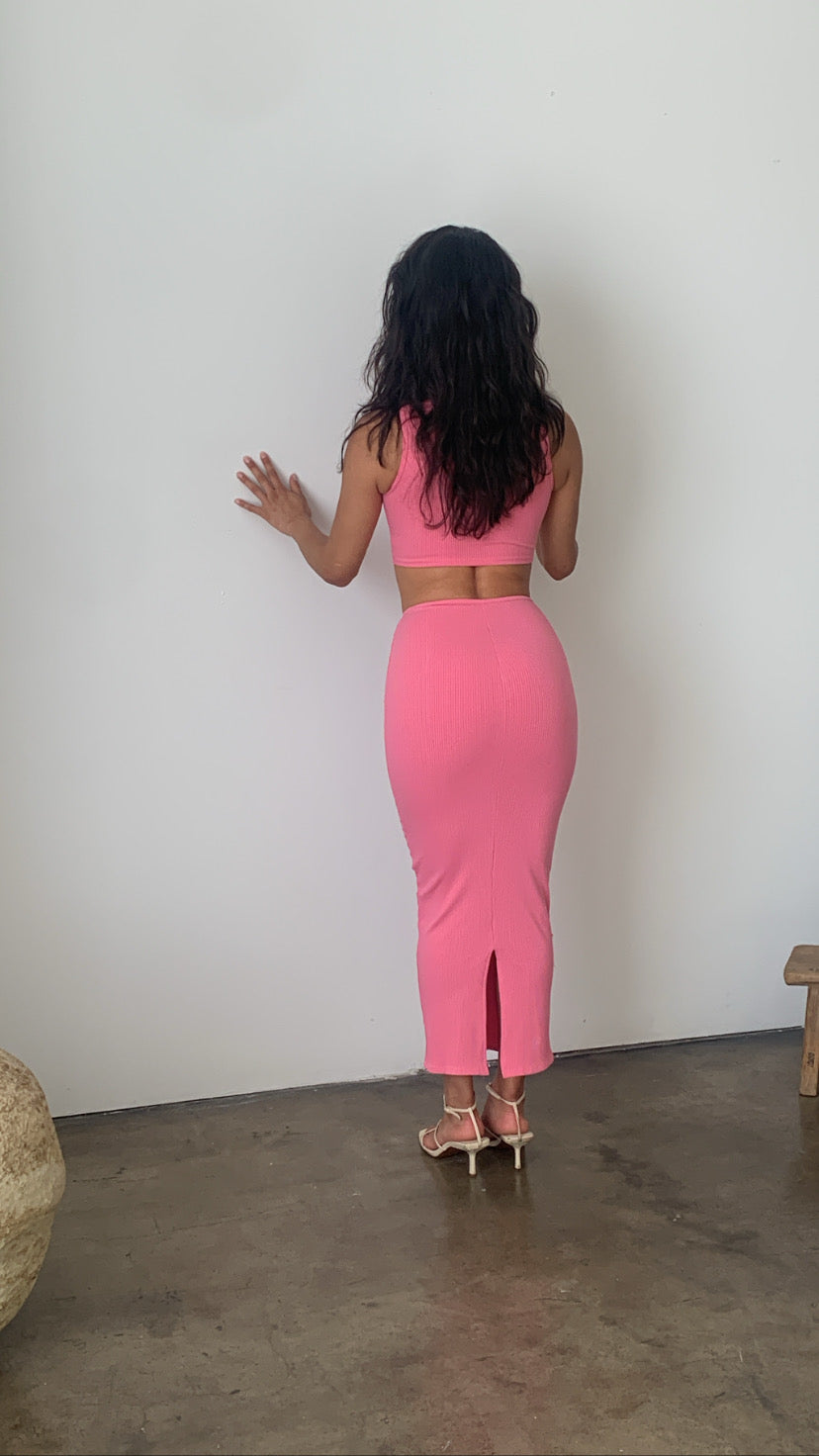 This slinky skirt set is timeless in every way! Designed in our thick ribbed knit fabric, this stunning skirt set features, a cropped top with round neck. The matching skirt comes adorned with a front ring detail and sexy back slit. Very Stretchy and hugs you in! Sold as a set. The perfect outfit worn together or even as separate pieces.
