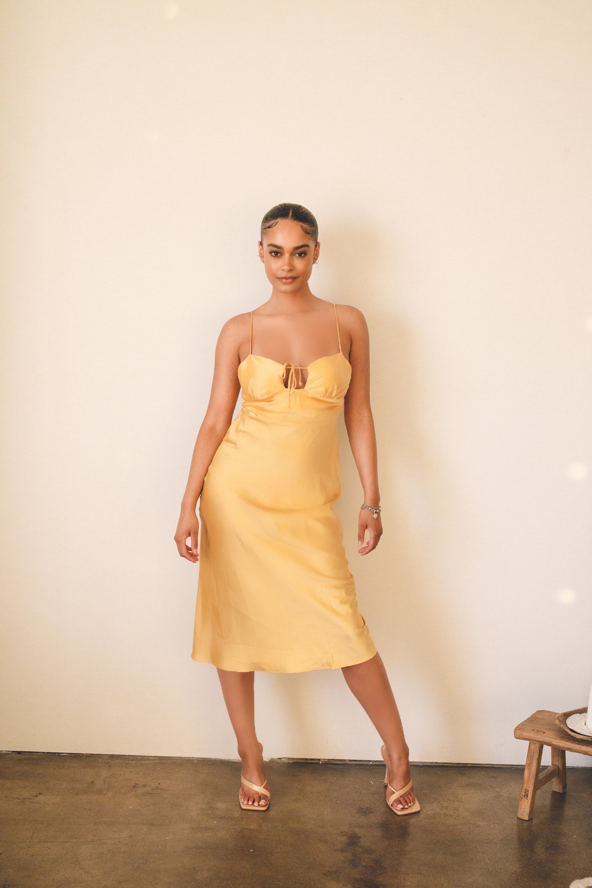 This slip on midi dress is sexy and flirty. A perfect day to night item! An effortlessly elegant and modern satin dress that features adjustable straps and a sweetheart neckline. Some stretch, some flow, all elegance. See you at brunch in this!